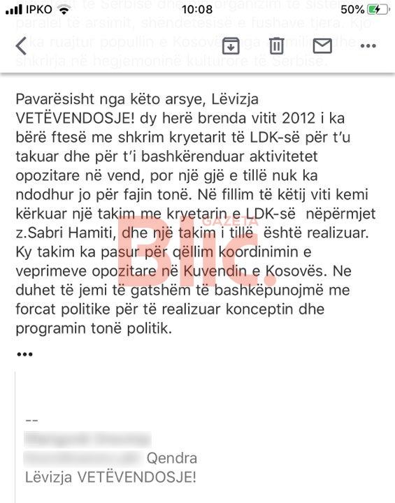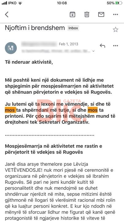 Në bazë të një komunikimi të brendshëm, të cilin Sekretariati i VV-së ua kishte përcjell përmes postës elektronike strukturave të partisë, ku ndalohej printimi dhe shpërndarja, figura e Rugovës ishte shënuar si e padëshiruar për një sërë arsyesh.