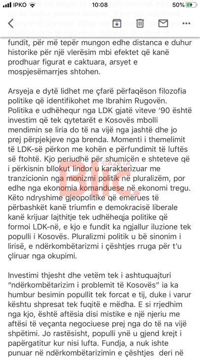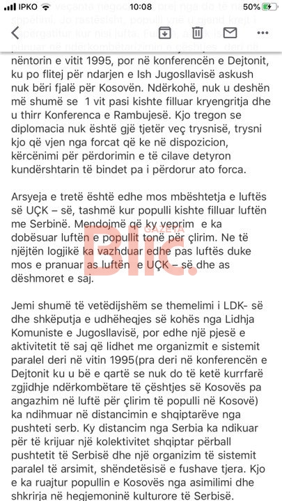 “Politika e udhëhequr nga LDK gjatë vitëve ’90 është invesim që tek qytetarët e Kosovës mbolli mendimin se liria do të na vijë nga jashtë dhe jo prej përpjkejve nga brenda. Momenti i themelimit të LDK-së përkon me kohën e përfundimit të luftës së ftohtë. Kjo përiudhë për shumicën e shteteve që i përkisnin bllokut lindor u karakterizua me tranzicionin nga moizmi politik në pluralizëm, por edhe nga ekonomia komanduese në ekonomi tregu. Këto ndryshime gjeopolitike që emërues të përbashkët kanë triumfin e demokraisë liberale kanë krijuar lajthitje tëk udhëheqja politike që formoi LDK-në, kjo e fundit ka ngjallur iluzione tëk populli i Kosovës. Pluralizmi politik u bë sinonim i lirisë, e ndërkombëtarizmi i çështjes rruga për t’u çliruar nga okupimi”, thuhet në këtë dokument, të cilin e ka siguruar “Gazeta Blic”