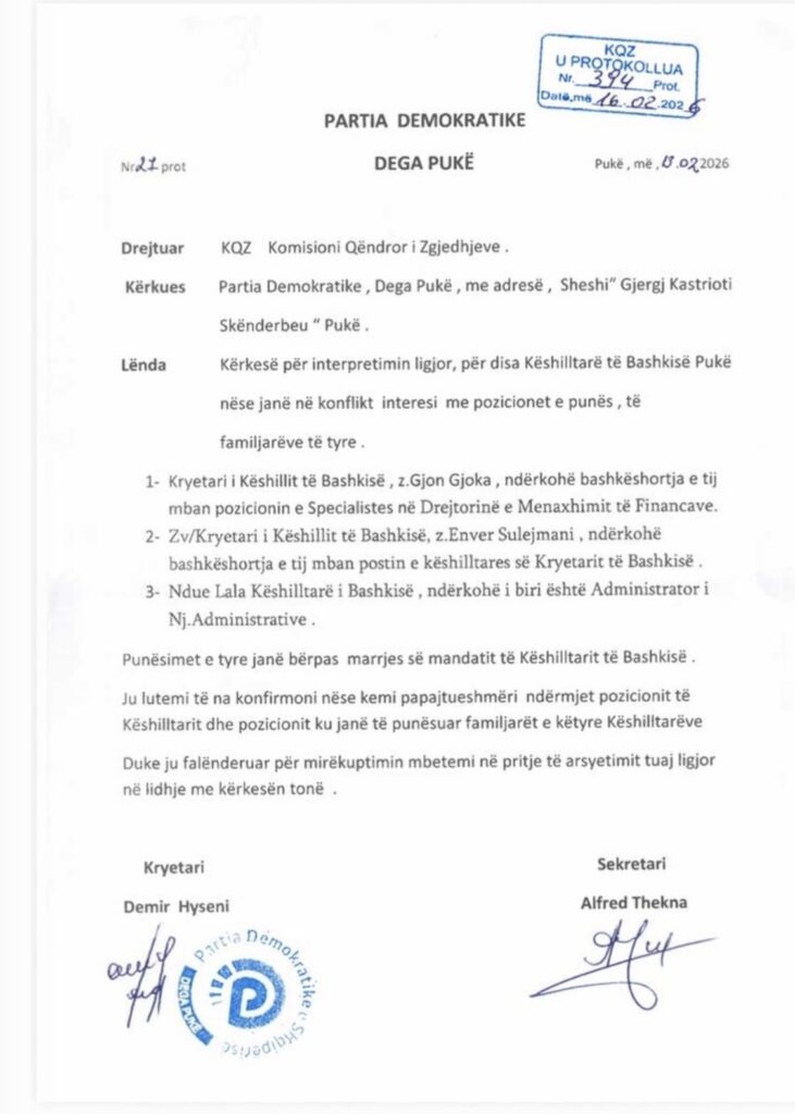 PUKË – Pretendimet e ngritura së fundmi për gjoja “nepotizëm” në Bashkinë Pukë, pas një shkrese të dërguar nga Dega lokale e Partisë Demokratike pranë Komisionit Qendror të Zgjedhjeve dhe publikimeve në disa media, nuk gjejnë mbështetje në interpretimin zyrtar të legjislacionit në fuqi dhe as në praktikën institucionale që ndjek administrata vendore.